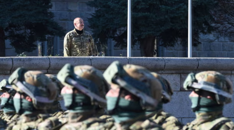 Photo: Azerbaijan’s president, Ilham Aliyev, watches a military parade in Nagorno-Karabakh after an offensive displaced 100,000 ethnic Armenians from the disputed territory last year. Photograph: President of the Republic Of Azerbaijan/Reuters